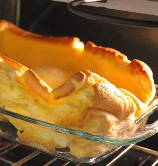 - Pour the batter over the melted butter and bake for 22 minutes or until edges have puffed up and started to turn brown.