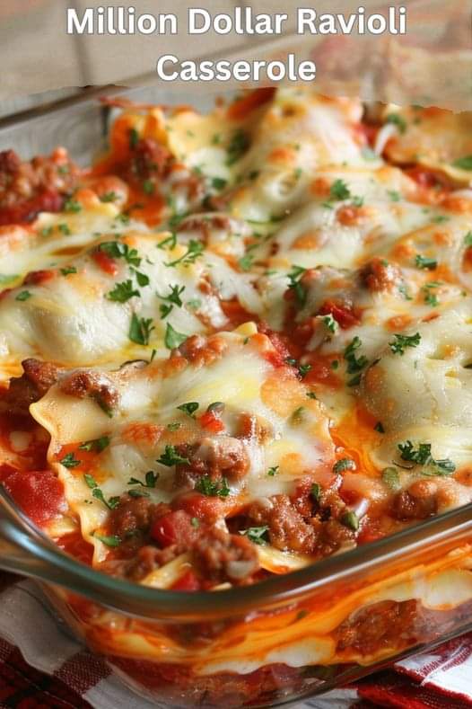 Assemble Casserole: Spread the ravioli mixture evenly in the bottom of the prepared baking pan. Pour the meat sauce over the ravioli and top with mozzarella cheese.