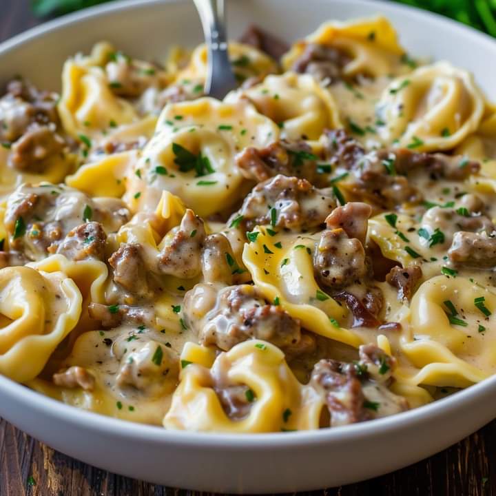 Combine: Add cooked tortellini, beef, and vegetables to the cheese sauce. Stir to combine.