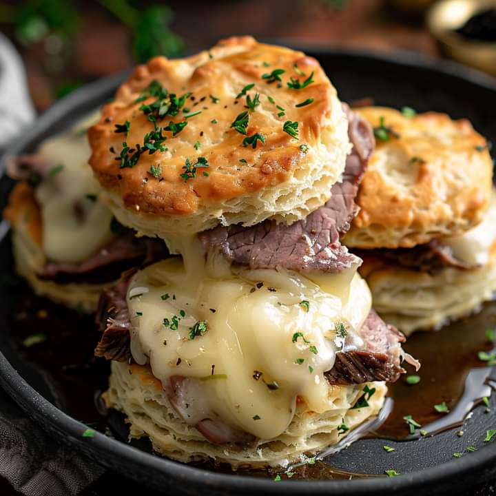 Bottom half of the biscuit layer with a slice of provolone cheese and roast beef. Top the meat and cheese with the remaining biscuit layer and pinch the edges to seal.