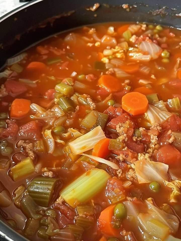 Place carrots, onions, tomatoes, cabbage, green beans, peppers, and celery in a large pot. Add onion soup mix, tomato juice, beef broth, and enough water to cover vegetables. Simmer until vegetables are tender. May be stored in the refrigerator for several days.