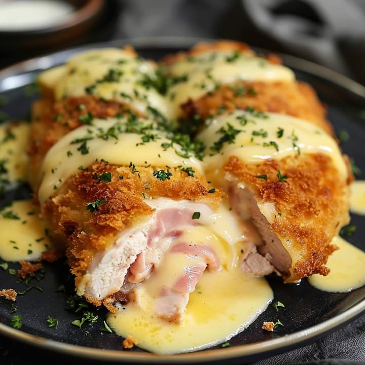 Lay 2 slices of Swiss cheese and 2 slices of ham on each chicken breast. Roll up each chicken breast, starting with the narrow end, and secure with toothpicks.