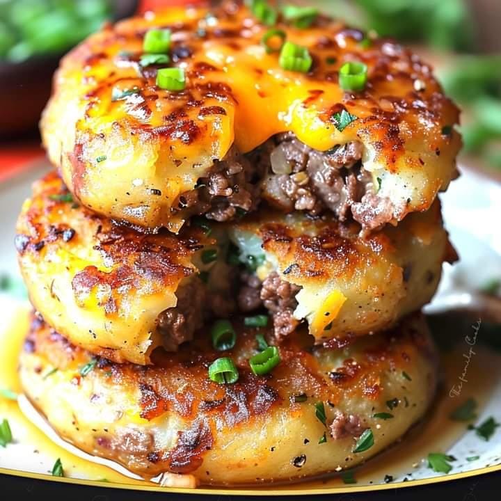 Place a spoonful of the beef mixture on a potato patty, top with shredded cheese, and cover with another patty, sealing the edges.
