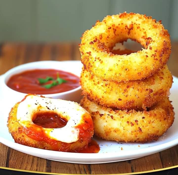 Fry the rings until golden brown, being careful not to fry them for too long as the cheese may ooze out completely.
